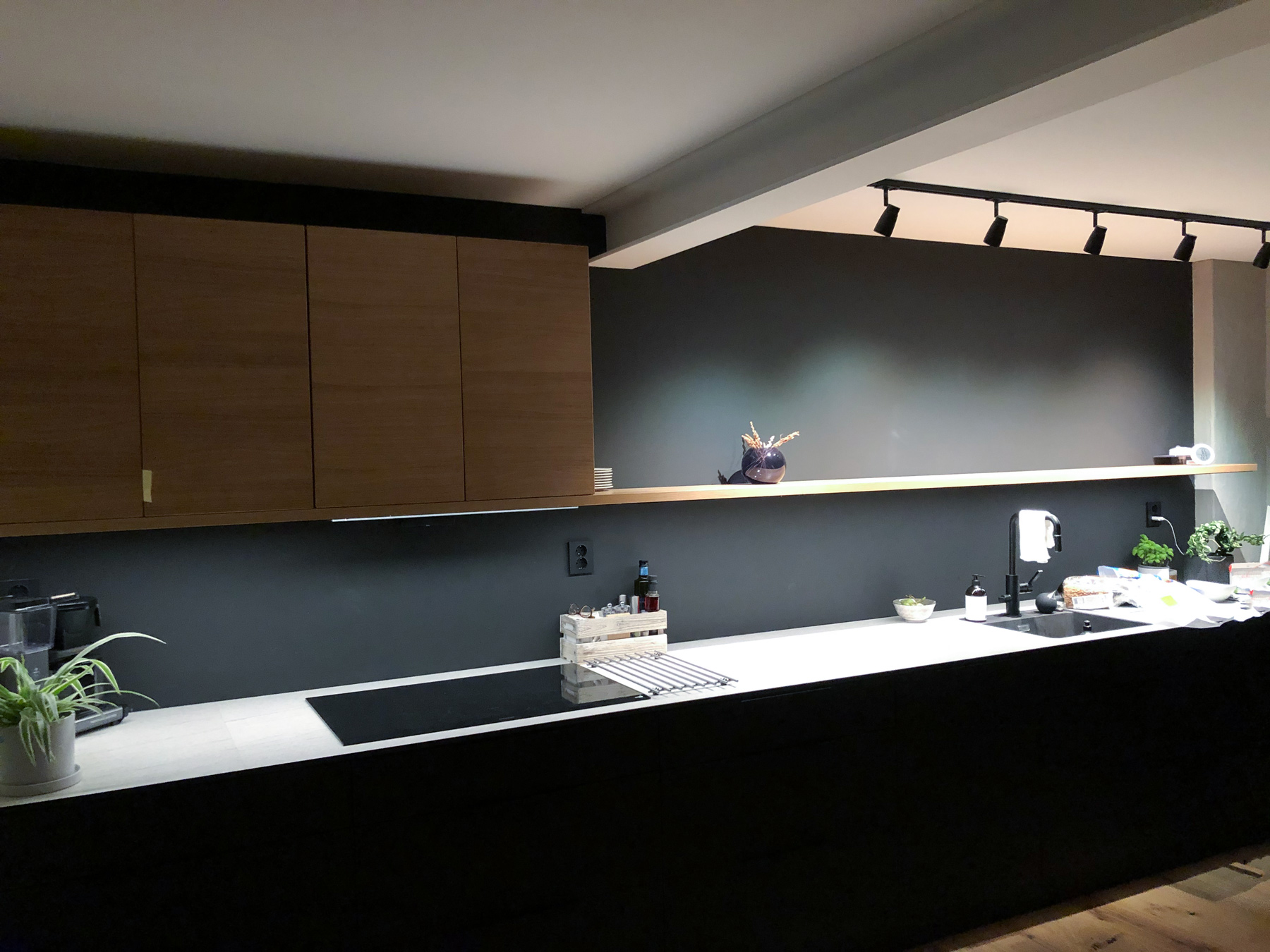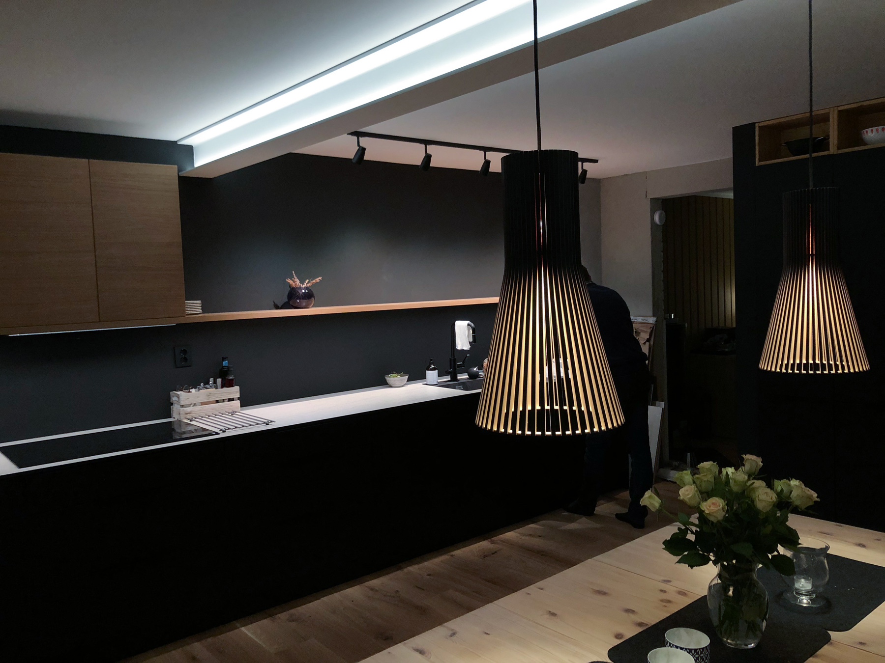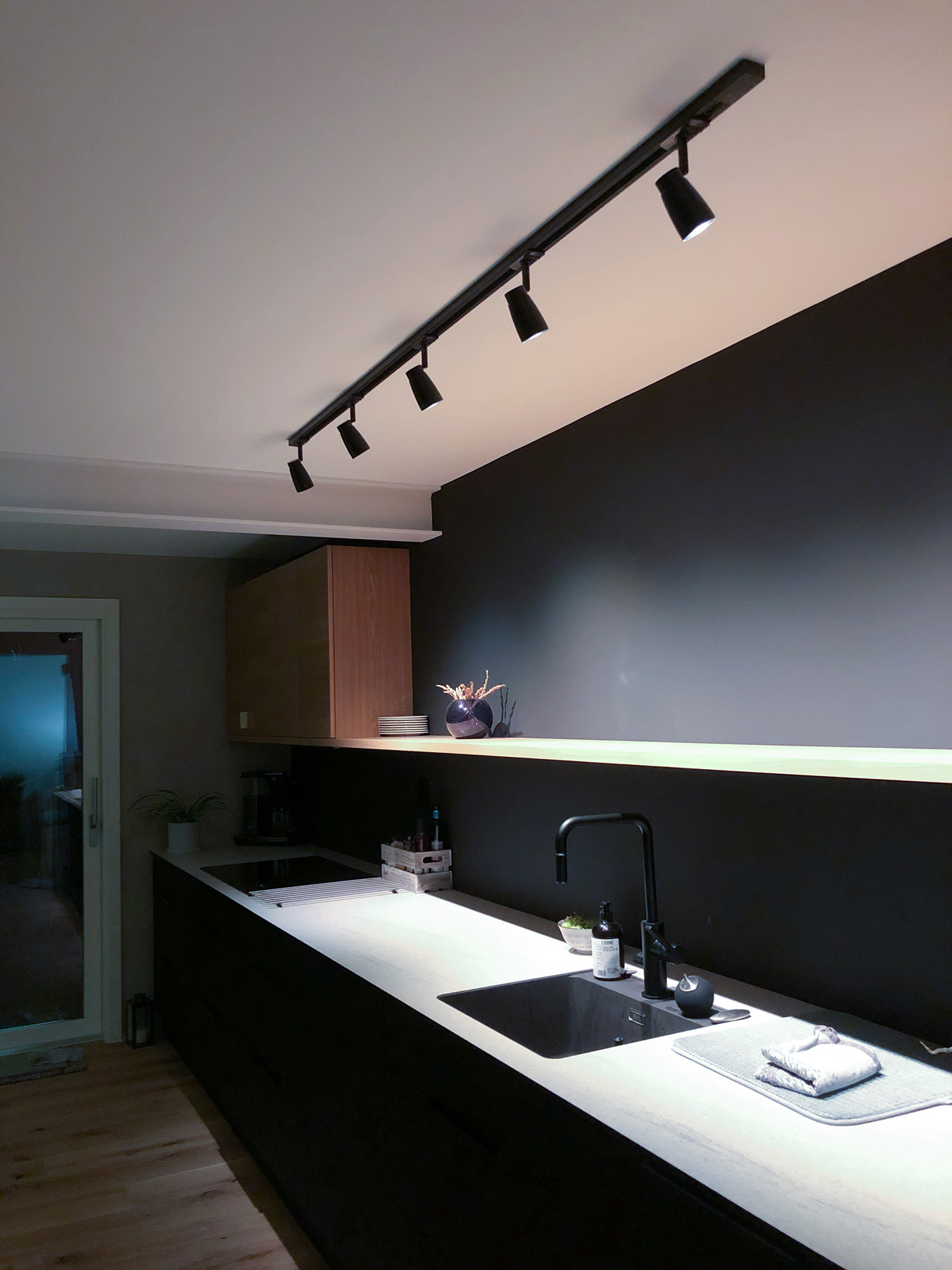 Bruk av strips på kjøkkenet over kjøkkenbenk og i synlig ståldrager, samt bruk av skinnelys og innfelte, slim downligths i bruksrom som bad, vaskerom og gang.