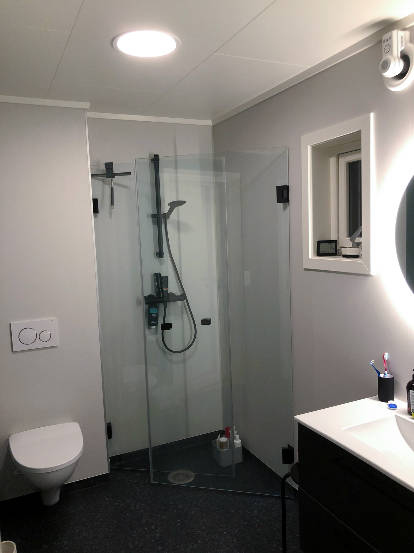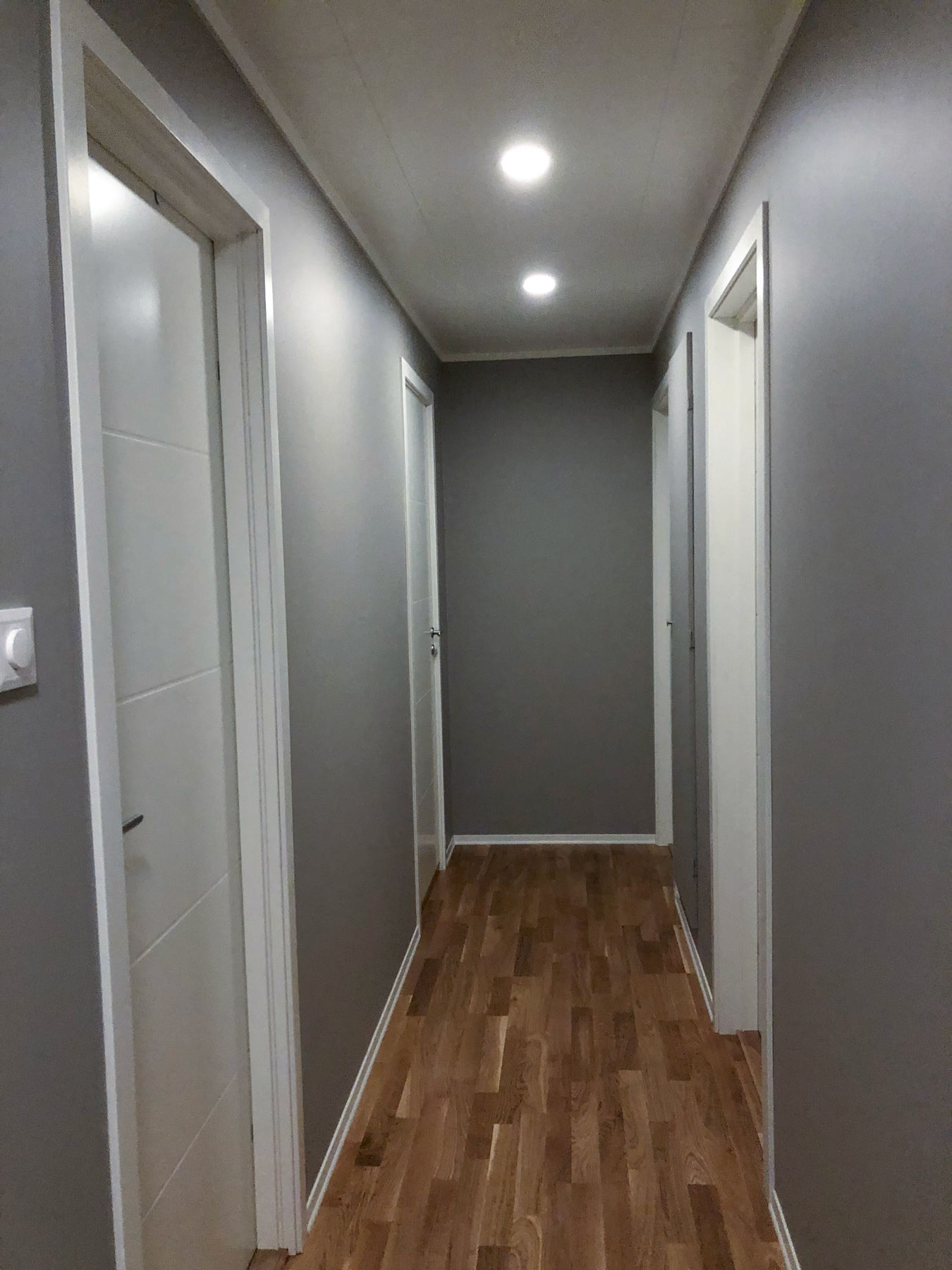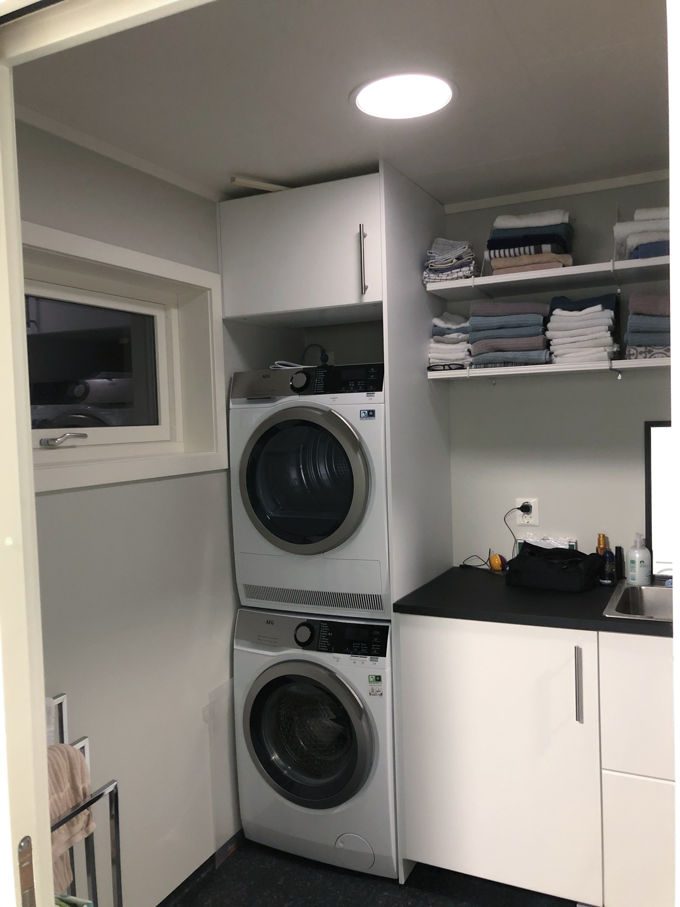 Bruk av strips på kjøkkenet over kjøkkenbenk og i synlig ståldrager, samt bruk av skinnelys og innfelte, slim downligths i bruksrom som bad, vaskerom og gang.